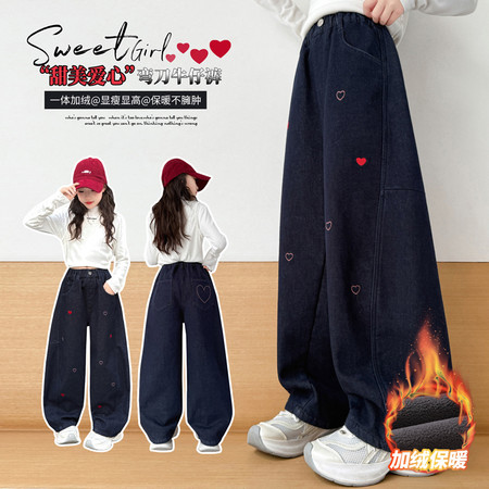 女童绣花爱心加绒牛仔裤