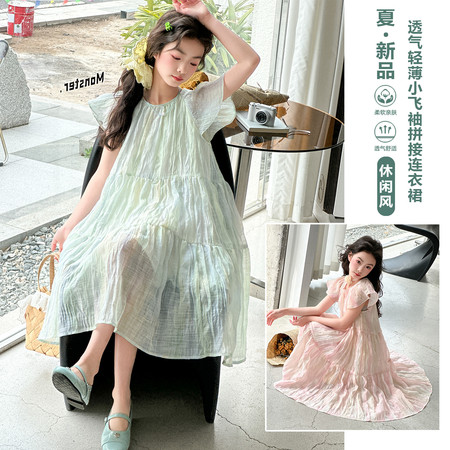 里布全棉 一件要2米多 女童扎染压皱小飞袖连衣裙